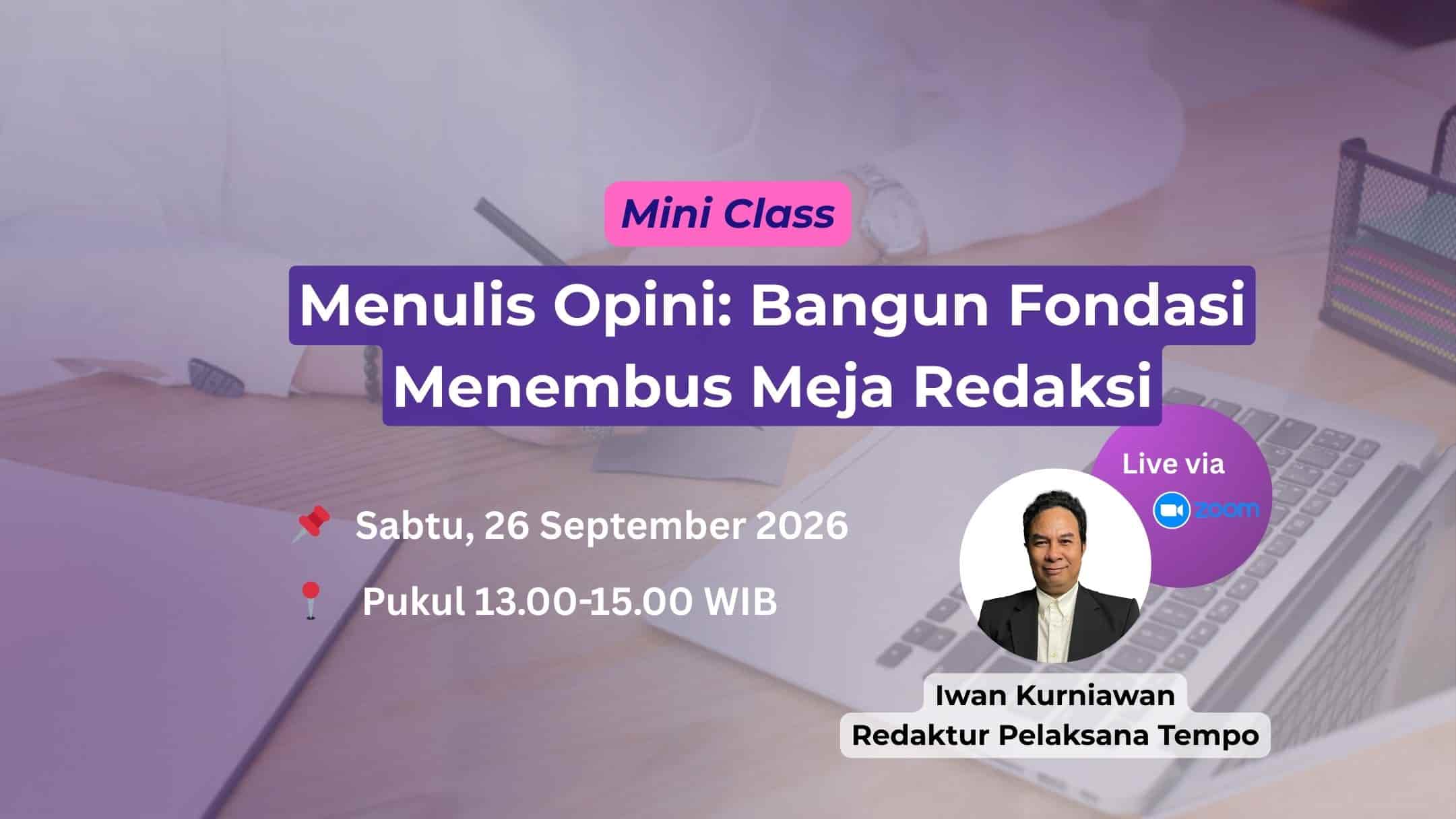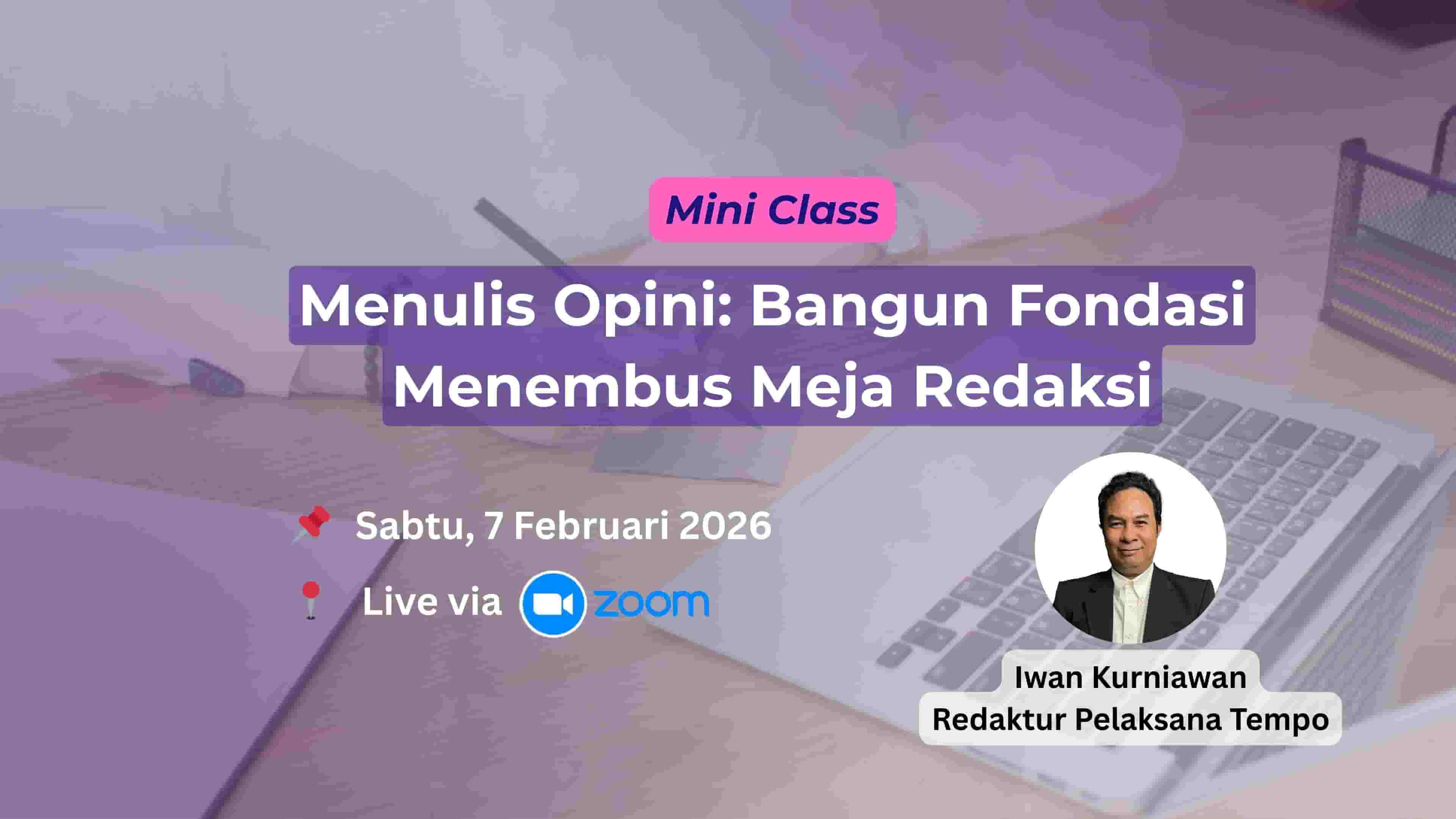 Ikuti Pelatihan Daring, Kelas Tanpa Batas dari Tempo Institute kapan saja dan di mana saja. Anda akan mendapat video mentor, bahan bacaan, soal latihan, Penjelasan, bank ide, mentoring jarak jauh*, dan sertifikat jika menyelesaikan kelas. Kelas Tanpa Batas dapat Anda akses selama 1 tahun sejak pertama kali dimulai. Direkomendasikan bagi Anda yang sibuk atau sulit menjangkau tempat pelatihan menulis yang berkualitas.